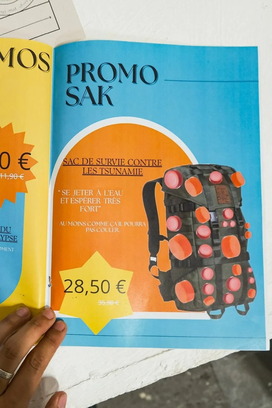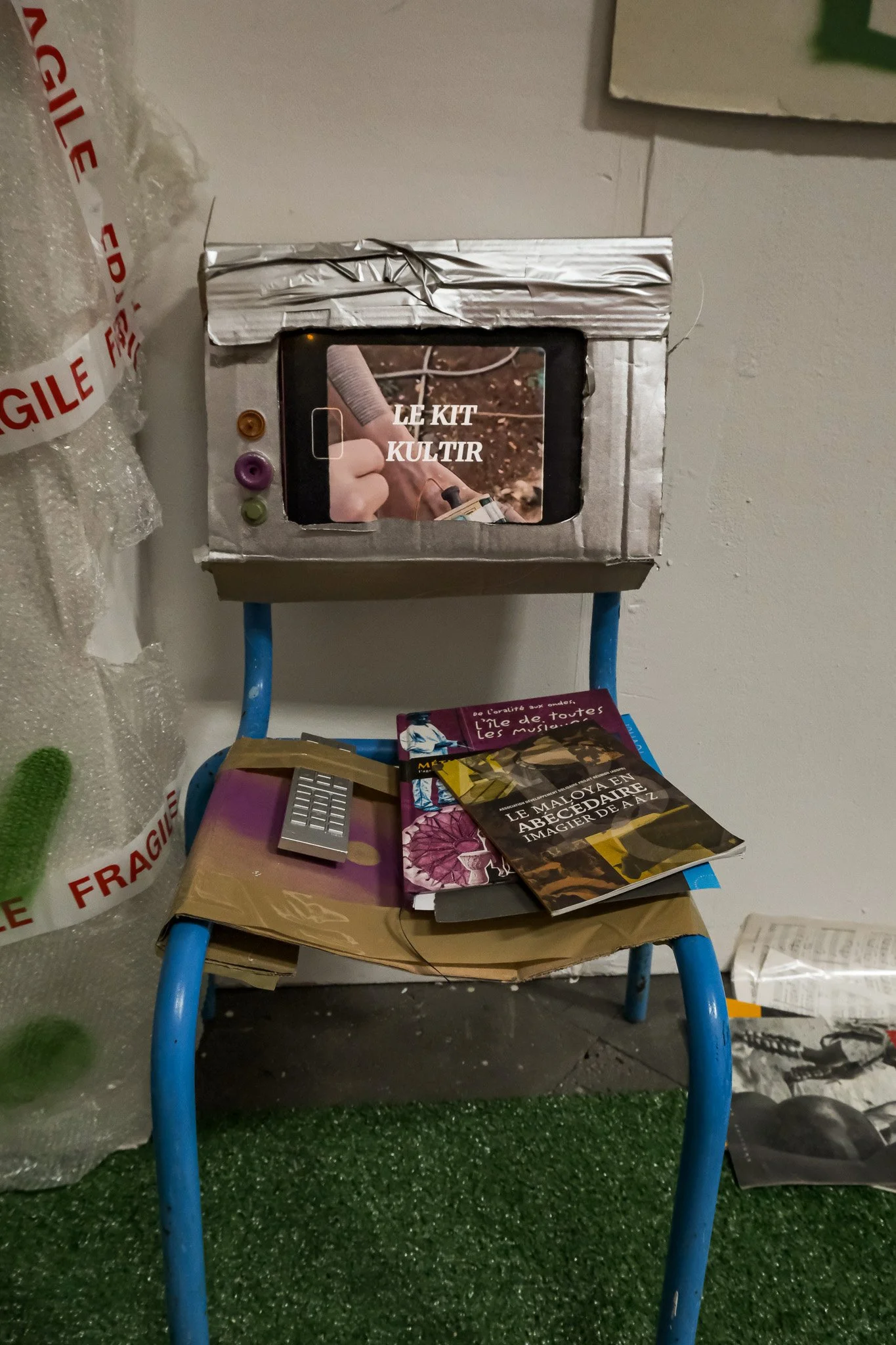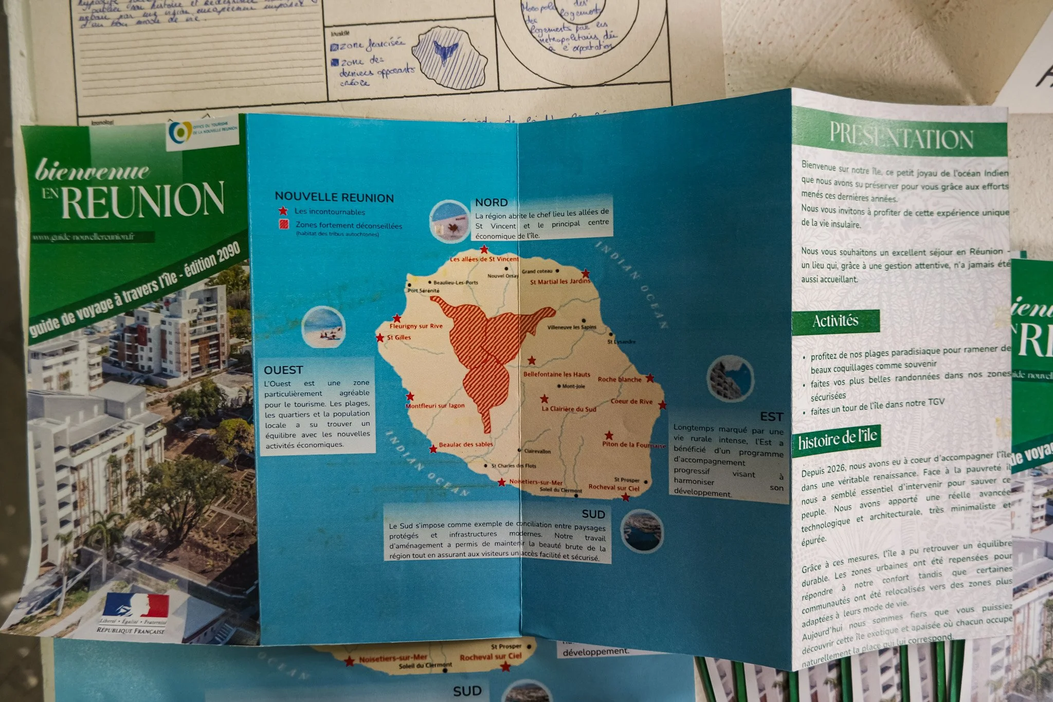 Les productions réalisées par les étudiant·es dessinent une cartographie critique de futurs marqués par l’exacerbation des logiques déjà à l’œuvre aujourd’hui. Par exemple parmi elles : un flyer de « bonne arrivée » destiné aux touristes, décrivant une île où les populations locales sont ségréguées et la culture réunionnaise effacée au profit d’un décor aseptisé ; le bureau clandestin d’un·e néo-marron·ne luttant pour la survie et la transmission de la langue créole ; une crème solaire indice +250 UV pensée comme solution marchande face à l’effondrement climatique ; ou encore une box Carrefour contenant nourriture en barres énergétiques et préservatifs, conçue pour « réguler » une population rendue précaire par les politiques économiques et sociales. Ces artefacts, volontairement provocateurs, rendent visibles les violences systémiques, les héritages coloniaux et les impasses d’un futur gouverné par le contrôle, l’extractivisme et la marchandisation du vivant.