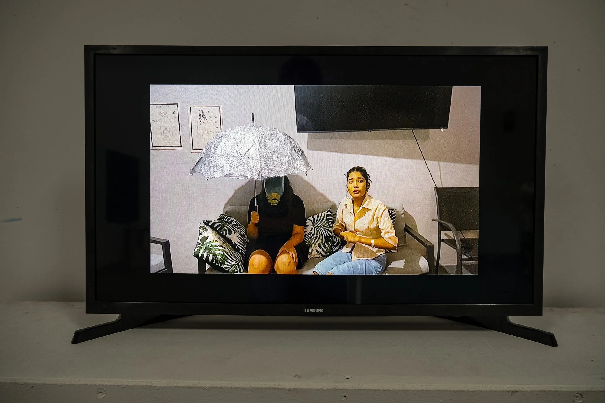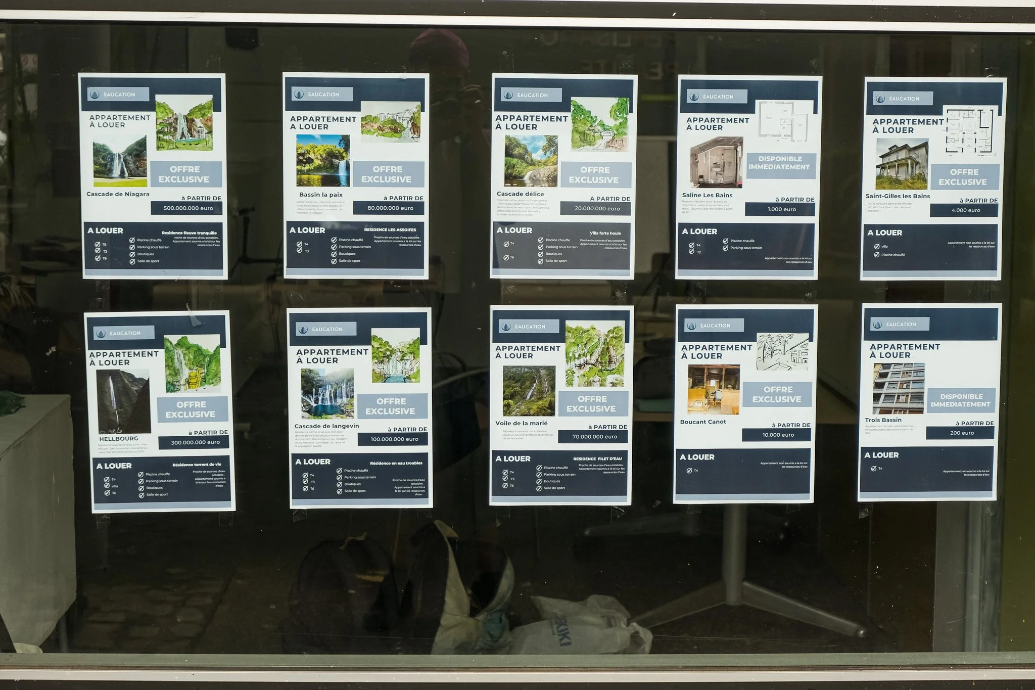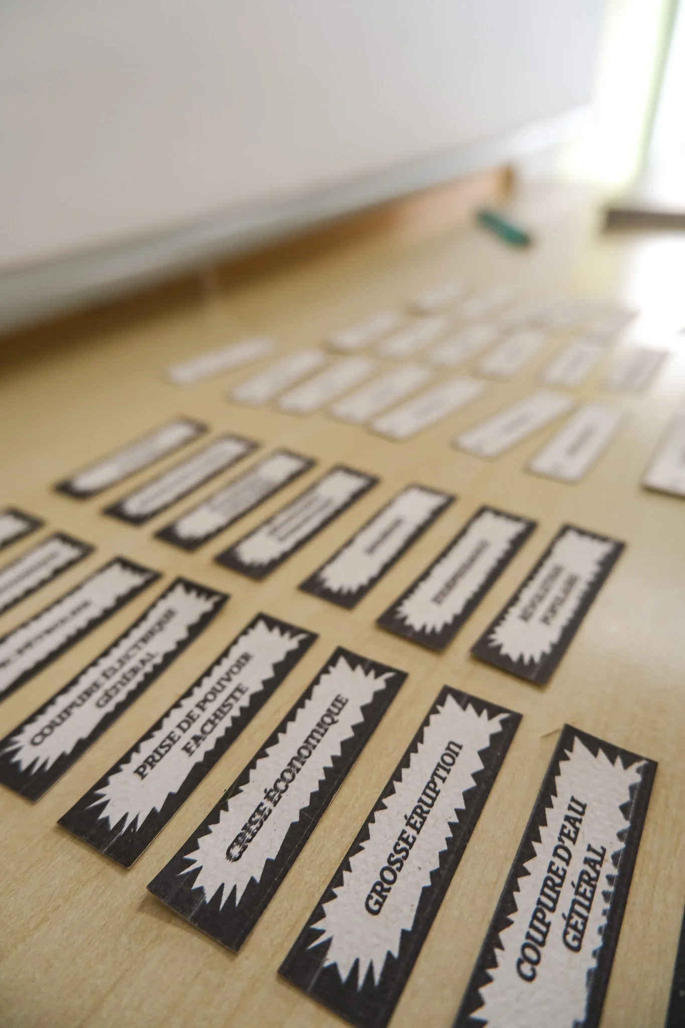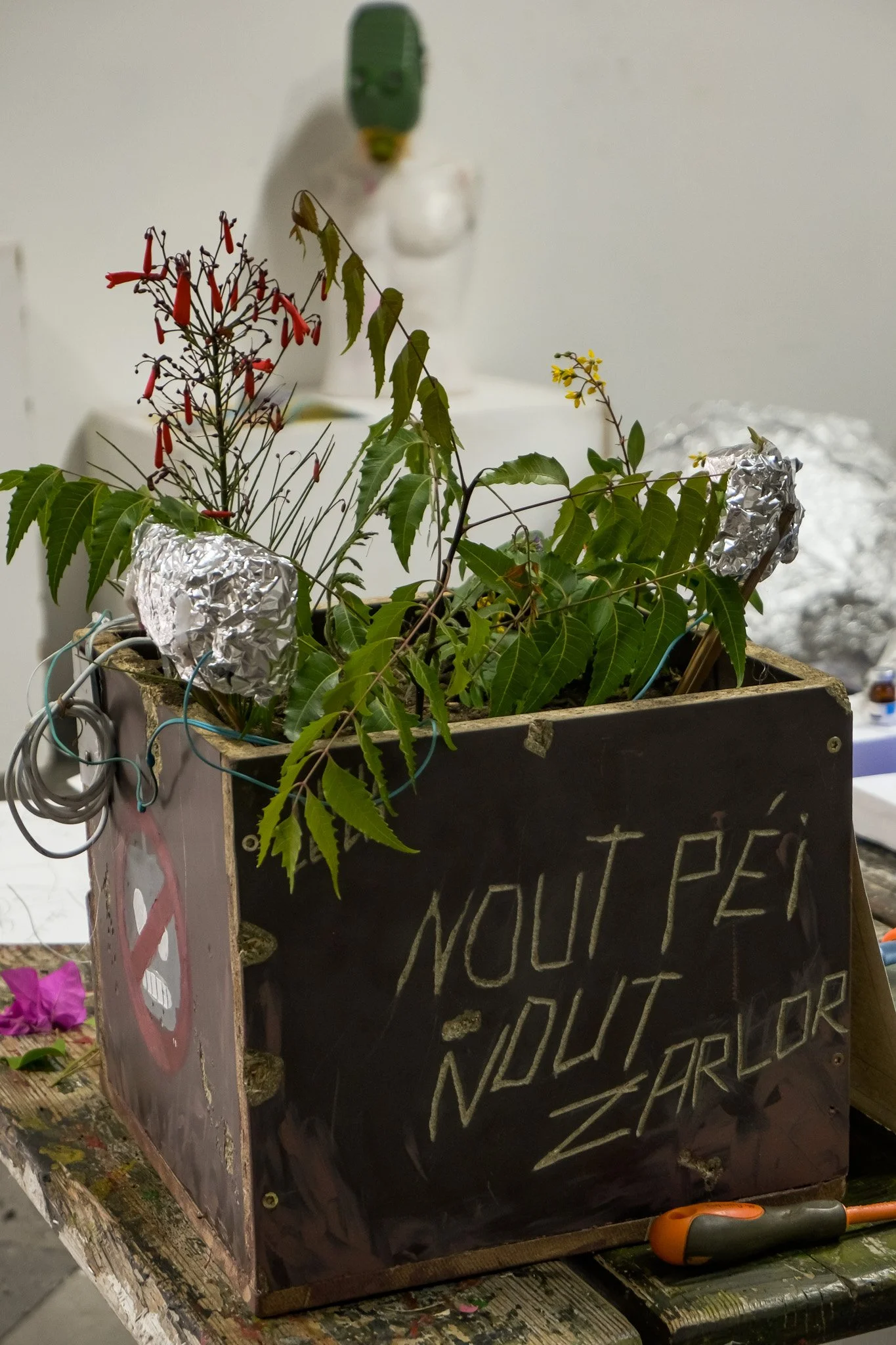 Les productions réalisées par les étudiant·es dessinent une cartographie critique de futurs marqués par l’exacerbation des logiques déjà à l’œuvre aujourd’hui. Par exemple parmi elles : un flyer de « bonne arrivée » destiné aux touristes, décrivant une île où les populations locales sont ségréguées et la culture réunionnaise effacée au profit d’un décor aseptisé ; le bureau clandestin d’un·e néo-marron·ne luttant pour la survie et la transmission de la langue créole ; une crème solaire indice +250 UV pensée comme solution marchande face à l’effondrement climatique ; ou encore une box Carrefour contenant nourriture en barres énergétiques et préservatifs, conçue pour « réguler » une population rendue précaire par les politiques économiques et sociales. Ces artefacts, volontairement provocateurs, rendent visibles les violences systémiques, les héritages coloniaux et les impasses d’un futur gouverné par le contrôle, l’extractivisme et la marchandisation du vivant.
