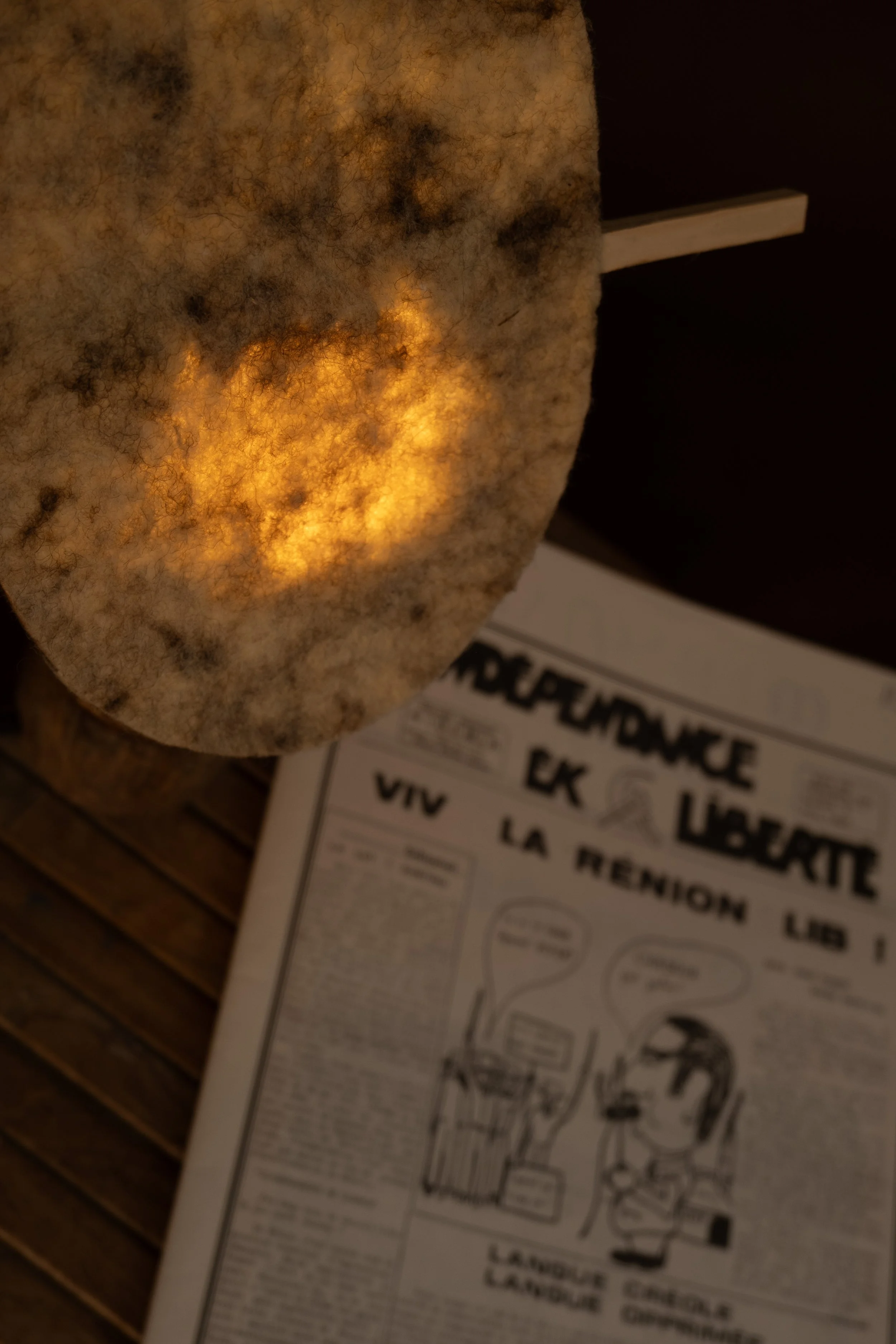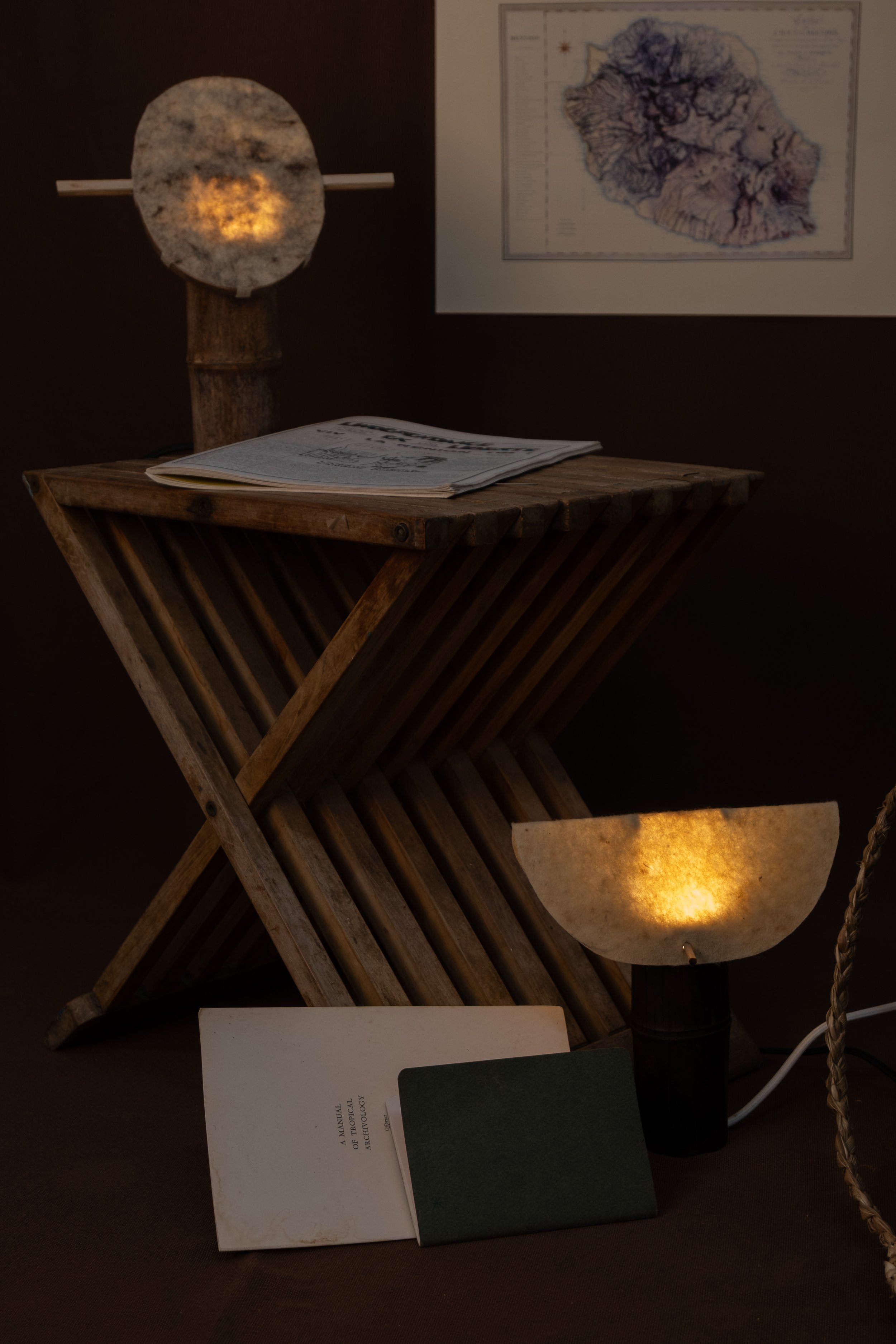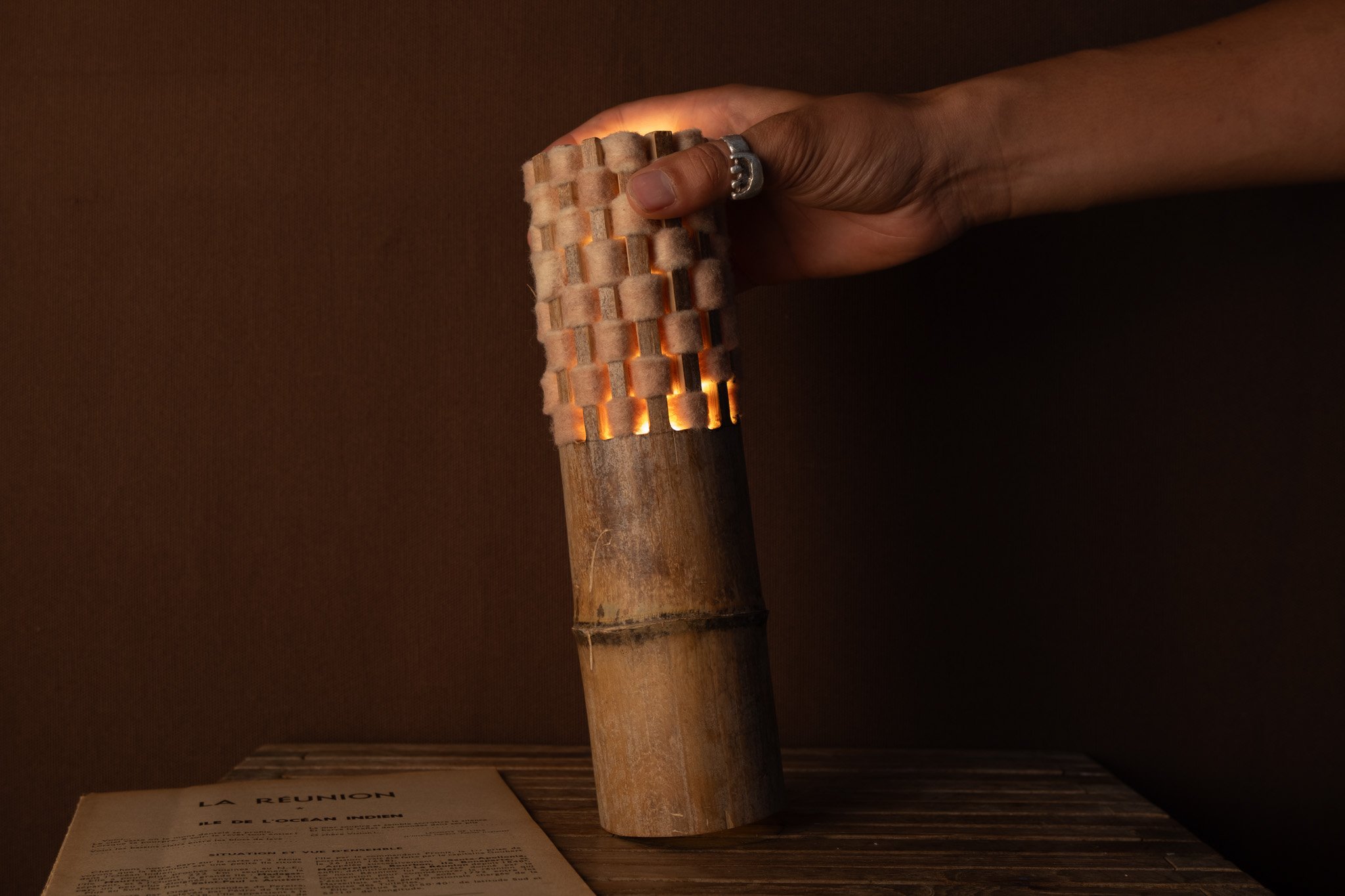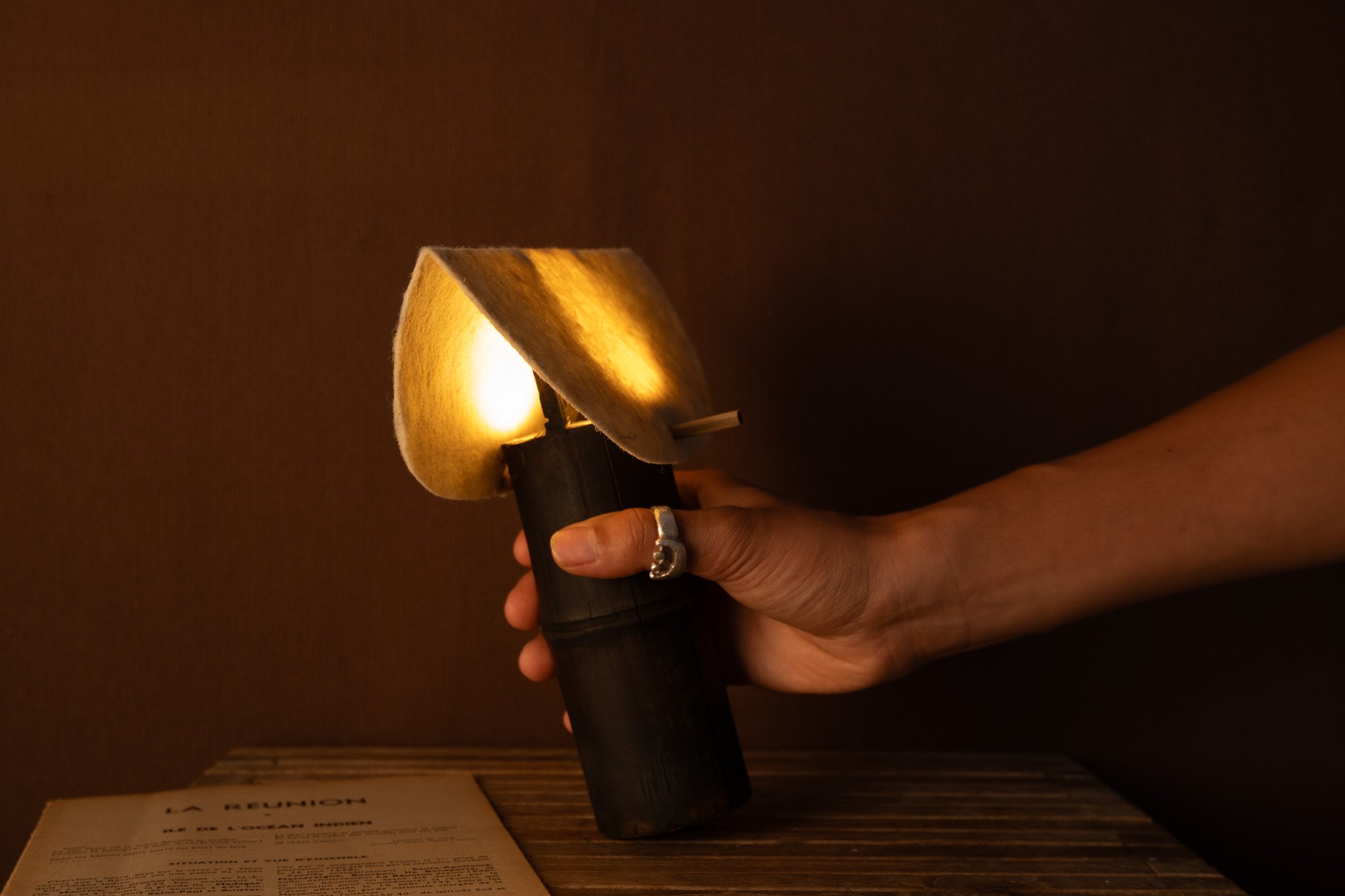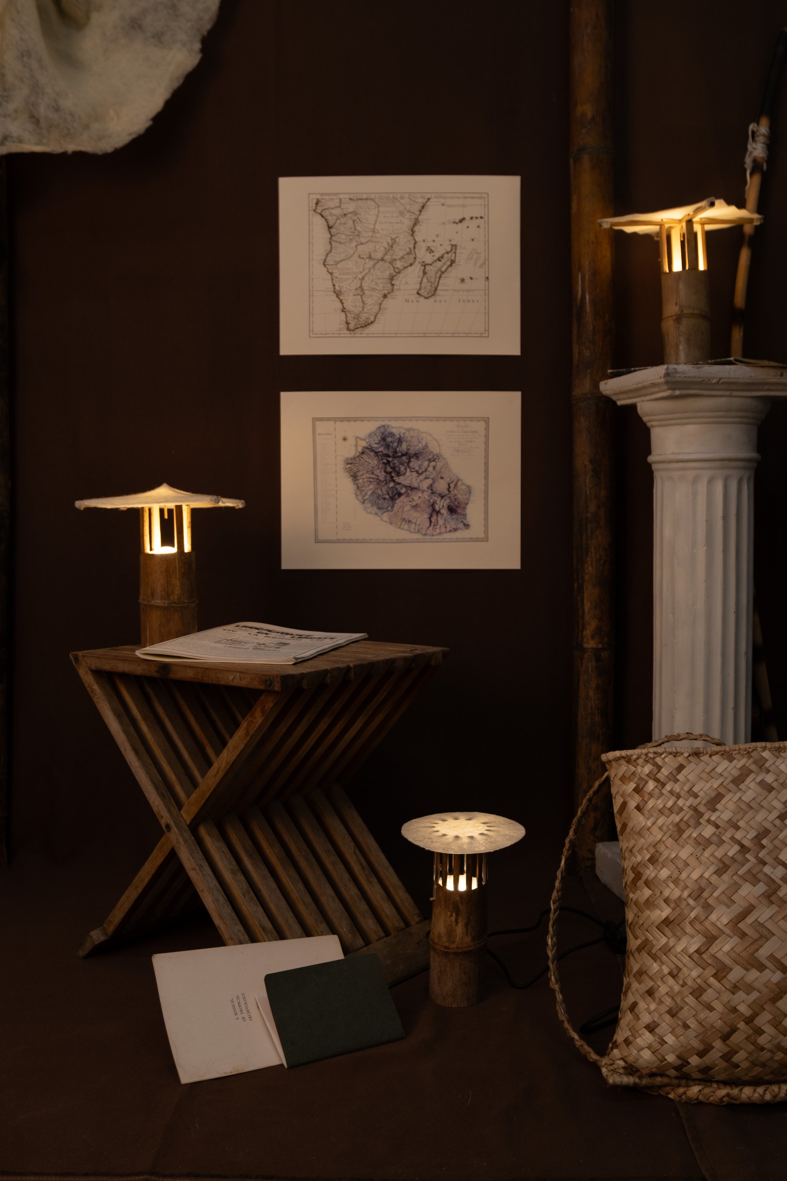 Ces lampes sont le reflet de la démarche du Kolektif Mayamay, des objets conçus comme des prétextes pour valoriser les matières et matériaux locaux, imaginer de nouveaux usages, explorer des potentiels filières locales. Dans un territoire fortement dépendant de l’importation, créer des objets locaux est un engagement
